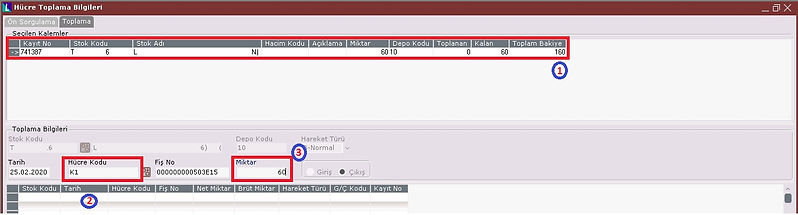 Hammadde Deponun DINAMIK DEPO olması ve transfer edilen hammaddenin Seri Takibi açık olması sebebiyle, bir önceki adımlarda yapılan iÅŸlemlerin DINAMIK DEPO sürecinde HUCRE TOPLAMA yapılarak hareket kaydının gerçekleÅŸtirilmesi gerekmektedir.