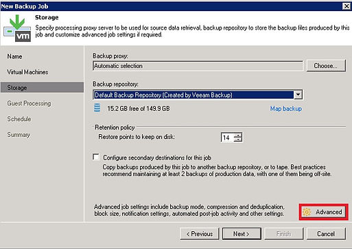 Storage kısmında Advanced sekmesini seçiyoruz. Restore point to keep disk seçeneÄŸi default olarak 14 gelmektedir. Ortaminizdaki disk boyutunuzun kapasitesine göre buradaki deÄŸeri yapılandırabilirsiniz